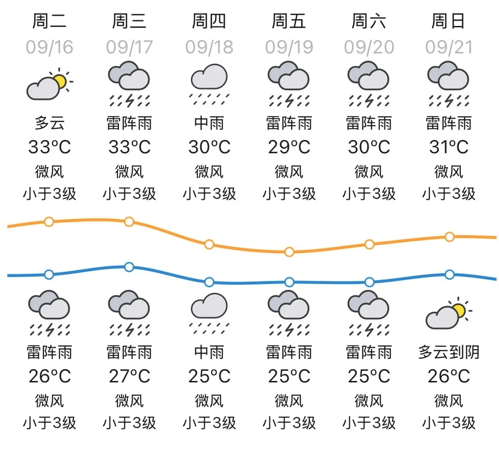 未来一周天气预报据汕头气象台消息,预计14日夜间15日受切变线和弱冷空气影响,多云转雷阵雨局部大雨,并伴有雷电和短时大风。