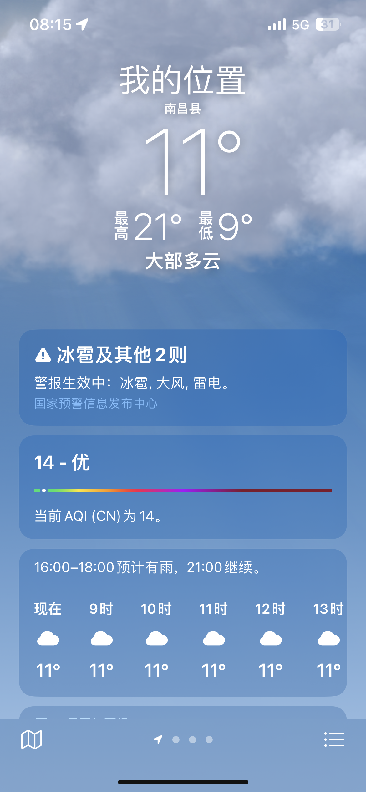 2、南昌市位于中国江西省,属于亚热带季风气候区,具有四季分明雨量充沛光照充足的特点根据历史天气统计数据,南昌一年中大约有241天下雨,多云天气有133天,阴天105天,而晴朗天气相对较少,只有104天在雨季方面,南昌的雨季主要集中在春季和夏季,尤其是3月至6月期间,此时受东亚季风影响,容易出现;白天阳光偶现,气温逐渐升高 5月23日白天有阵雨,夜晚延续 5月24日阵雨继续,但气温稍降 5月25日天气转为多云,午后有小雨因此,虽然未来一周南昌有阵雨天气,但并非主要以阵雨为主,还伴随着多云和小雨天气建议市民根据具体天气情况,合理安排出行计划,并随身携带雨具;南昌最新天气预报发布,提供南昌今日天气明天天气以及未来一周天气情况,帮助大家及时了解气温风向风力等详细天气信息,以便根据天气调整生活和工作计划南昌市地处北半球亚热带区域,受到东亚季风影响,形成了典型的亚热带季风气候,气候湿润温和,日照充足一年四季中夏季和冬季较长,而春秋季则较短;年平均风速为23米秒,无霜期在251至272天之间冬季常吹偏北风,夏季则多为偏南风这种气候条件非常适合植物和花卉的生长,使得南昌成为一个理想的“花园城市”建设地无论是炎炎夏日还是寒冷冬季,南昌的气候特征为当地居民的生活和植物的生长提供了独特的环境未来三天的天气情况如下首日,预计。
